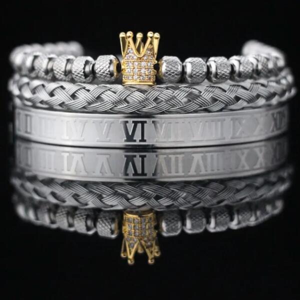 Jadrin karkötők A Jadrin karkötők királyi megjelenést és luxust adnak a megjelenéséhez. Ez a háromrészes szett tartalmaz egy hangsúlyos római számokkal díszített karkötőt, egy elegáns fonott karkötőt, egy díszes gyöngyökből álló és királyi koronával díszített karkötőt. Minden karkötő az eleganciát és az erőt képviseli, akár önállóan, akár szettben visel