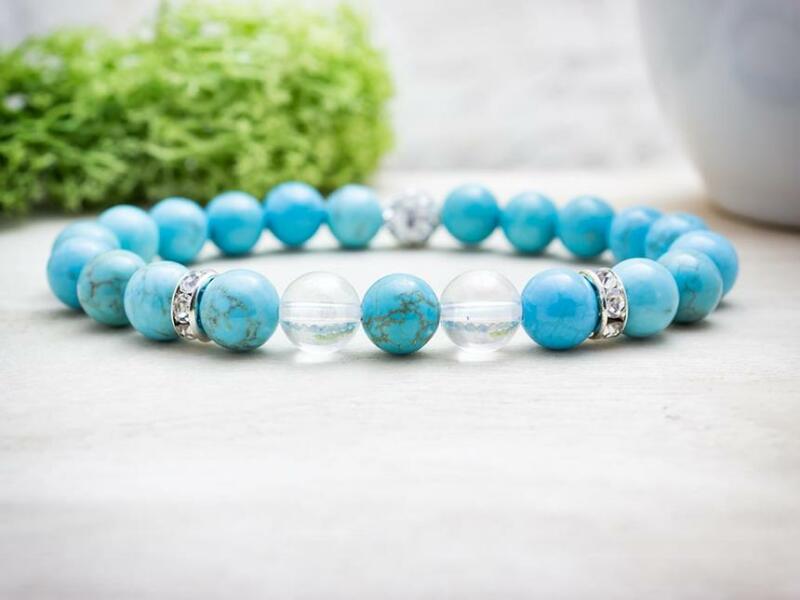 A aurakvarc és festett türkiz ásvány golyók gumira vannak felfűzve. Amit a türkizről érdemes tudnod: A türkiz színe halványkék - halványzöld, átlátszatlan. A kék ég és a tenger, a végtelen átlátszó magasság és mélység szimbóluma, a régi időkben szent kőnek tartották. Kedveltsége az oszmán birodalom idején érte el csúcspontját. Keleten a türkiz még ma is sze