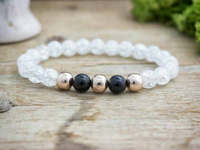 Ónix, hematit és roppantott hegyikristály ásványokból fűzött gumis karkötő. Amit az ónixról érdemes tudnod: Az ónix általában fekete, néha előfordulhat fehér, szürkés csíkozódással is. Lelki gyógyhatása: Az ónix egy védelmező kő, amely a negatív energiák ellen véd. Csökkenti a befolyásolhatóságunkat, növelve így az önbizalmunkat, egészséges egónkat. Egyen