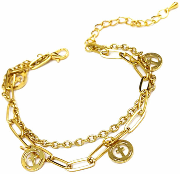 Kereszt charmos karkötő, 4 charmmal. Paramé terek: Charm mérete 1 cm. Anyaga nemesacél, karkötő anyaga rozsdamentes acél. Karkötő mérete 17+5 cm. (Ha ettől eltérő méretet szeretnél, rendeléskor a MEGJEGYZÉSBE írd be. ) Szélesség 4 és 3 mm.