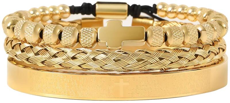 Dolorite Karkötők A Dolorite karkötők szépen mutatnak a csuklón, fényűző és különleges hatást keltenek. A szett három darab karkötőt tartalmaz, amelyek különböző kialakításúak: merev vésett mintás, merev fonott és zsinórra fűzött kereszt medálos, arany színű gyöngyökkel. Mindegyik darab úgy készült, hogy szépen mutassanak külön-külön is, de harmonikusan mu
