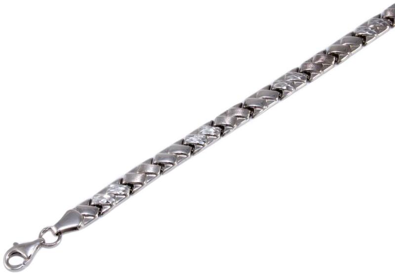 Modern stílusú, ródiummal bevont, véséssel és mattítással díszített, üreges kialakítású, stiftes, mutatós fehérarany karkötő.