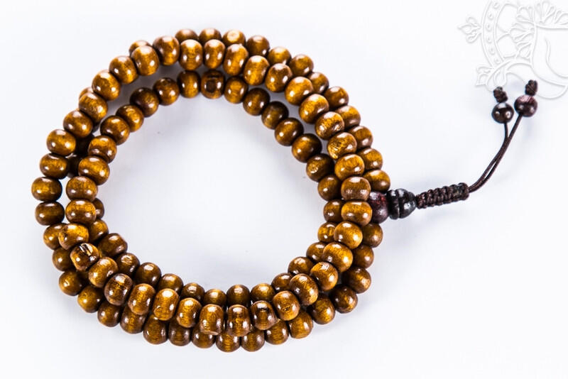 108 szemes, állítható antikolt barna fa mala. A szemek között lévő távolság a guru szemnél kézre állítható, így mindenki be tudja állítani a neki megfelelő rést. Kerülete 73 cm. A termék áldott
