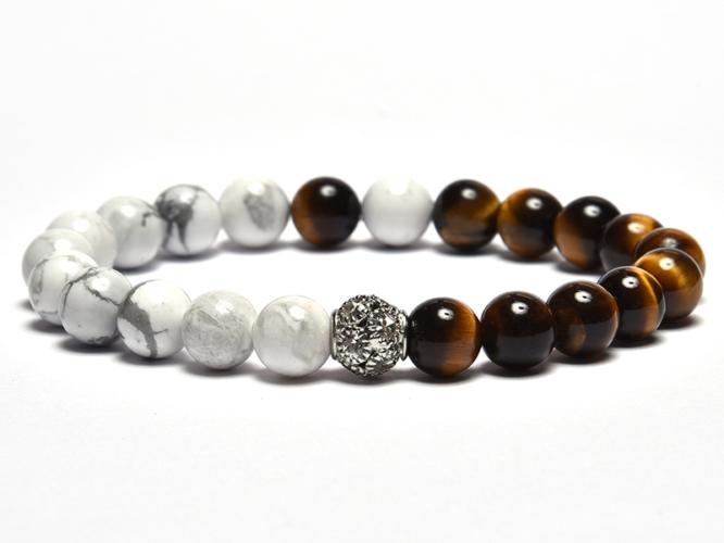 A karkötő 8 mm-es tigrisszem és howlit ásvány gömbökből készült, a díszítőelem 1 db 9 mm-es kétsoros strasszgolyó. A karkötő méretének meghatározása : a csuklód méretéhez adj hozzá 1,5 cm-t. Az ásványok nem helyettesítik az orvosi diagnózist és kezelést. A tigrisszem hatása : a tigrisszem, ha vannak elérendő céljaid, biztosítja hozzá a kellő kreativitást és