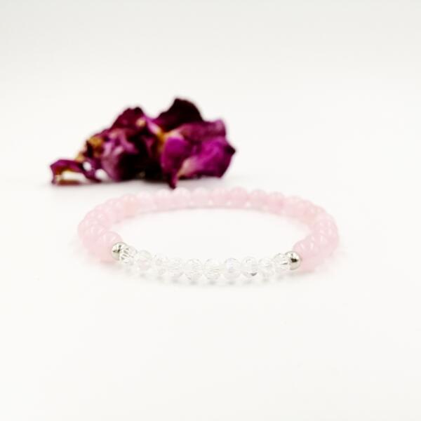 Egyedi tervezésű 6 mm rózsavarc és 4 mm csillogó fazettált mikrokristáy gyöngyökből készült karkötő. Nagyon kifinomult exkluzív darab, mely minden öltözéket feldob.
