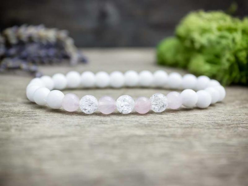A 6 mm-es rózsakvarc, jáde és roppantott hegyikristály gyöngyök gumira vannak felfűzve. Amit a jádéről érdemes tudnod: A Jáde egy gyűjtőcsoportja a kövek egy fajtájának. A zöld kínai jáde az egyik legnépszerűbb és leggyakoribb a csoporton belül, amelyik hazájában Kínában nemzeti kőnek számít. Lelki gyógyhatás: A zöld szín általános nyugtató hatással bír. Iga
