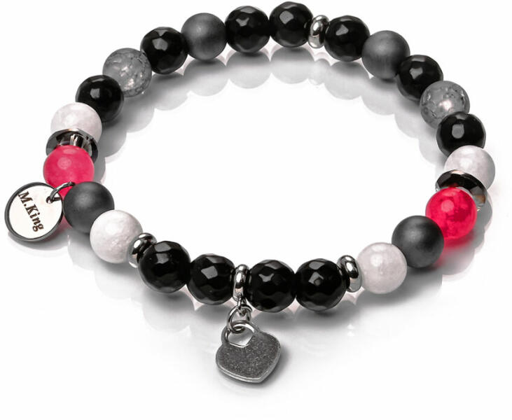 Romantikus, minden alkalomra kiváló ónix, hematit és jade ásvány karkötő szív charmmal, nincs is ennél szebb üzenet. A Maria King kollekció kiemelt darabja. Figyelem! A képen exkluzív kivitelű, rugalmas karkötő látható kapocs nélkül, de kérheted extra erős acélsodronyra is delfinkapoccsal és 5 cm hosszabbítólánccal. Ha a kapcsos verziót kéred, ami nem szakad, nem nyú