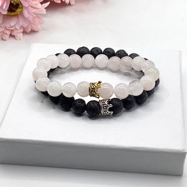 Páros ásvány gyöngyös karkötő: rózsakvarc és lávakő ásványokból párban, King/Queen korona medállal Felhasznált ásványok: 8 mm-es rózsakvarc 8 mm-es lávakő Tudtad hogy... A rózsakvarcot az egyetemes szerelem kövének tartják: helyreállítja a harmóniát a zavaros kapcsolatokban, bátorítja a békés és racionális kommunikációt, elősegíti az együttérzést és más