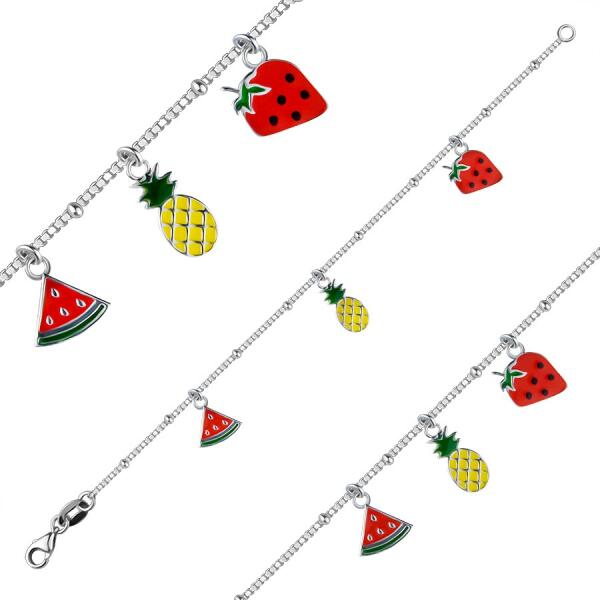 A 925 ezüstből készült gyermek karkötő sima, szögletes láncszemekből áll, fényes gyöngyökkel díszítve. A láncon egy metszett dinnye alakú medál található magokkal, sárga ananász zöld szárral és piros eper magokkal és levelekkel. A karkötő homár karmos zárással rendelkezik. A sárgadinnye méretei: 10 x 11 mmAnanász méretei: 6 x 14 mmEper méretei: 9 x 13 mmLánc sz