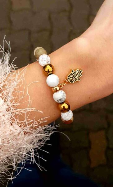 Egyedi tervezésű prémium minőségű kristákykarkötő, aranyszín díszítéssel hamzsakéz medállal. Az ásványkarkötő ásványai:*képjáspis*te jkvarc*howlit*roppantott hegyikristály*matt kristály*aranyra festett lávakő