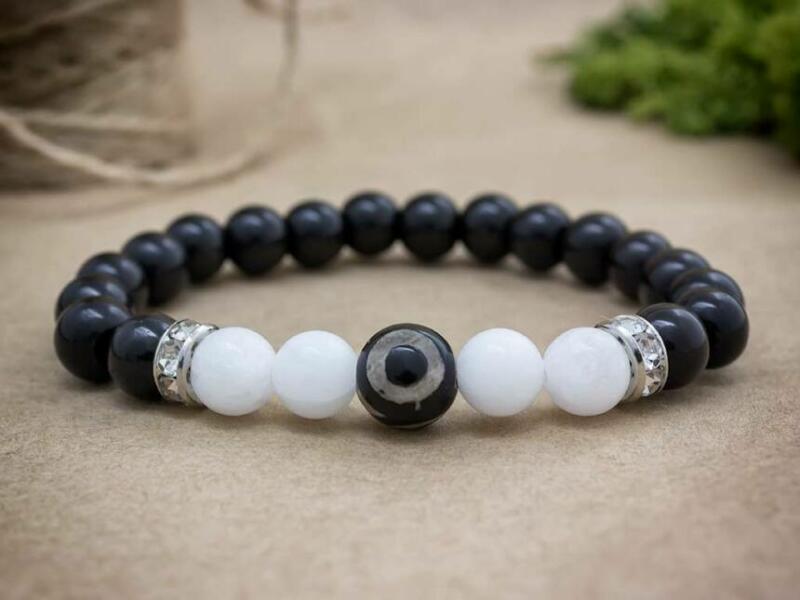 8 mm-es fekete achát és tejkvarc ásvány gyöngyökből fűzött gumis karkötő. Az ékszert egy oltalmazó szem gyöngy is díszíti. Amit az achátról érdemes tudnod: Az achát minden színben fellelhető, többnyire szürke, kékesszürke, zöldesszürke, szürkésfehér, barna csíkozással, áttetsző. Lelki gyógyhatás: Az achát lelki gyógyhatásai közül a legkiemelkedőbb a segí