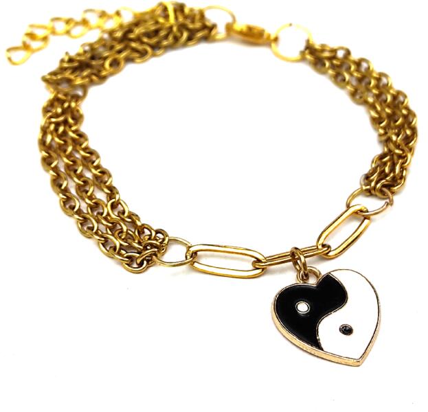 Három soros divat karkötő fekete-fehér szív alakú jin-jang charmmal, arany színű. Paraméterek: Charm mérete kb. 1,5 cm. Anyaga fémötvözet, karkötő anyaga rozsdamentes acél. Karkötő mérete 17+5 cm. (Ha ettől eltérő méretet szeretnél, rendeléskor a MEGJEGYZÉSBE írd be. )