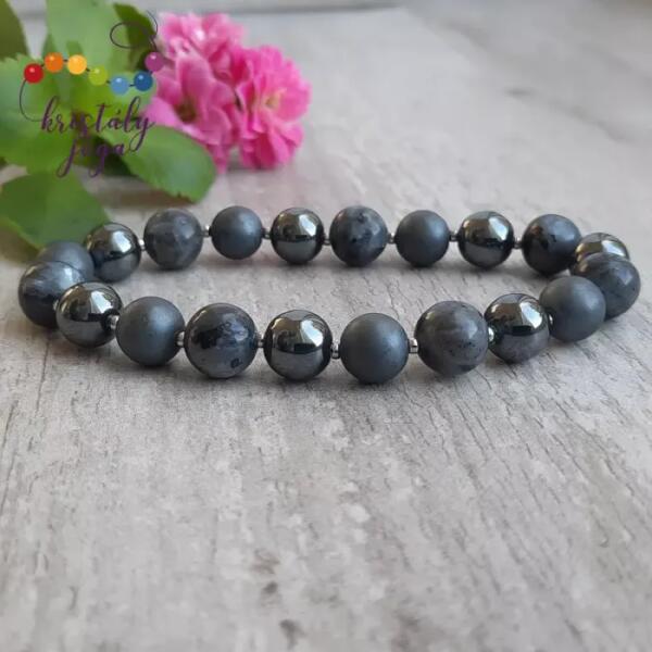A karkötő 6 mm-es sötétszürke hematit gömböket tartalmaz, duplasorosan gumira fűzve. A karkötő méretének meghatározása : a csuklód méretéhez adj hozzá kb. 1,5 cm-t. Az ásványok nem helyettesítik az orvosi diagnózist és kezelést. A hematit csiszolatlan állapotban sötét szürke és vörös színben előforduló ásvány. Felhasználása sokoldalú, a vaskohászatban magas