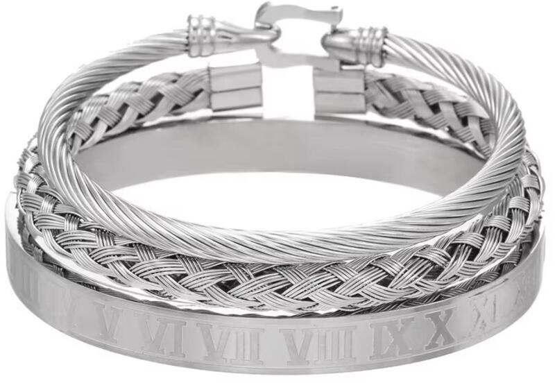 Delmore karkötők A Delmore karkötők a modern luxus mesterművei. Ez a karkötő három különálló darabból áll, amelyek mindegyike egyedi jellemzőt hoz: az egyik finom fonással, a másik precíz mintával, a harmadik pedig sima, római számokkal, amelyek eleganciát adnak hozzá. Minden darabot viselhet önállóan vagy kombinációban, ami lehetővé teszi, hogy az alkalomhoz igazíts
