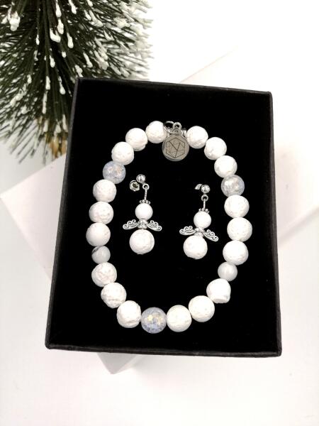 Ékszerszett, mely egy angyalka fülbevalópárból és egy karkötőből áll, mely hófehér lávakő illetve robbantott hegyikristály ásványból lett készítve ! Ez a szívhez szóló személyes ajándék, egészen biztos, hogy örök élmény marad és sikert arat!