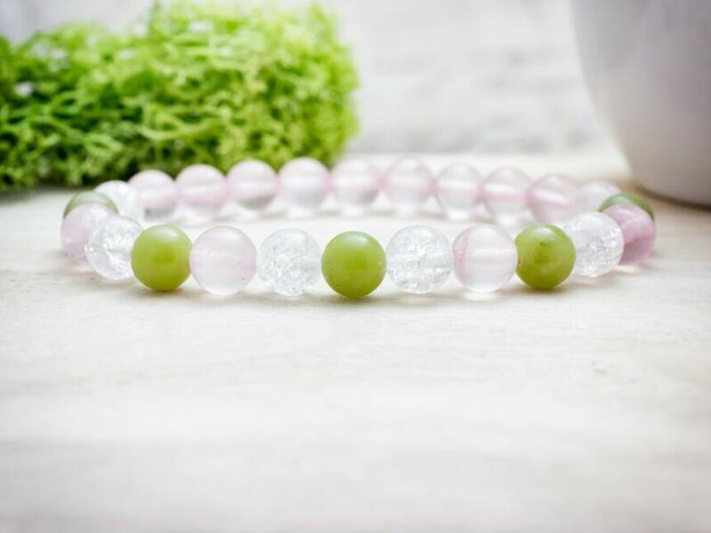 A festett jáde, rózsakvarc és roppantott hegyikristály ásvány golyók gumira vannak felfűzve. Amit a rózsakvarcról érdemes tudnod: A festetlen rózsakvarc az egész világos, szinte áttetszőtől, a ködös középrózsaszínig terjed. Az egyik legnépszerűbb kövek egyike, amely szépséges küllemének és erős gyógyhatásának köszönhető. Története a görög és római mitol