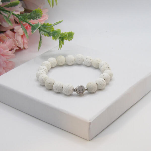 Egyedi, gondosan, szeretettel, kézzel készített karkötő fehér lávakő ásványból, (ásvány karkötő) egy db fém betűvel, monogrammal. Ajánljuk ezt a fehér színű lávakő ásványból készült unisex karkötőt mindenkinek, hiszen egyaránt mutatós férfiakon és nőkön is ez az egyszerű, mégis elegáns ásvány karkötő. A lávakő ásványból készült karkötő nem csak c