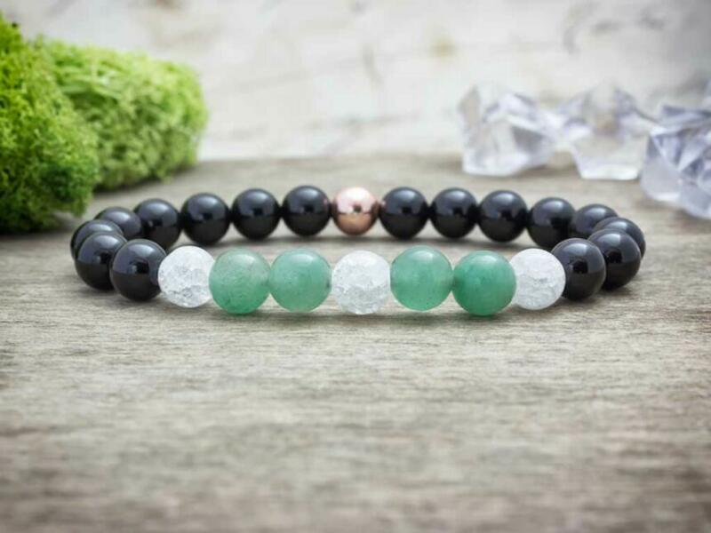 8 mm-es ónix, aventurin, hematit és roppantott hegyikristály ásvány gyöngyökből fűzött gumis karkötő. Amit az ónixról érdemes tudnod: Az ónix általában fekete, néha előfordulhat fehér, szürkés csíkozódással is. Lelki gyógyhatása: Az ónix egy védelmező kő, amely a negatív energiák ellen véd. Csökkenti a befolyásolhatóságunkat, növelve így az önbizalmunka