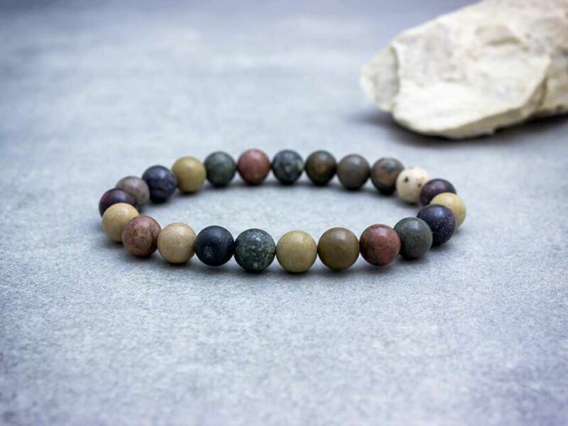 Jáspis ásvány karkötő. Az ásvány golyók gumira vannak felfűzve. Amit a jáspisról érdemes tudnod: Gyakori előfordulása és a földszínek széles skálája miatt a jáspist ősidők óta használják dísztárgyak és pecsétek készítésére. Mágikus ereje miatt is nagyra értékelték. Úgy hitték, hogy túlvilági szellemi cselszövések ellen véd és a szerelmi bánatot mérs