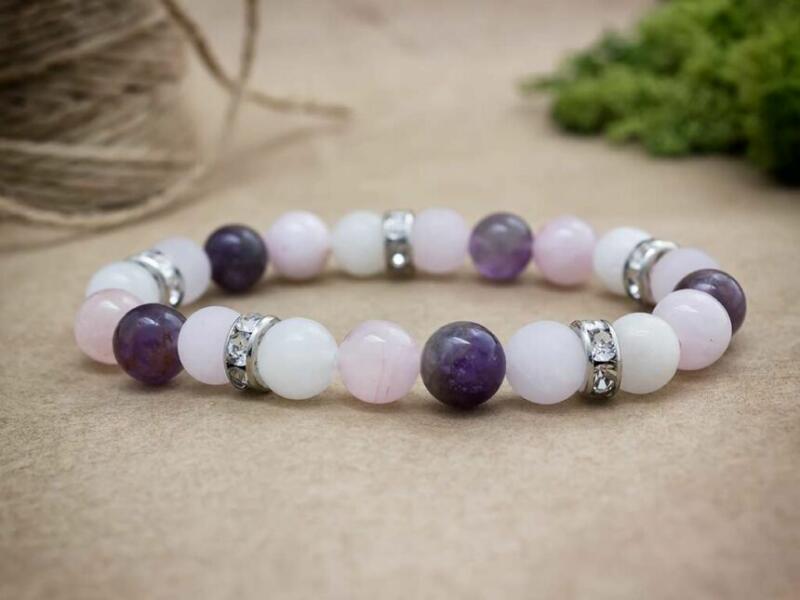 8 mm-es rózsakvarc, ametiszt és jáde ásvány golyókból fűzött gumis karkötő. Az ékszer dísze több kristályokkal kirakott gyűrű. Amit a rózsakvarcról érdemes tudnod: A festetlen rózsakvarc az egész világos, szinte áttetszőtől, a ködös középrózsaszínig terjed. Az egyik legnépszerűbb kövek egyike, amely szépséges küllemének és erős gyógyhatásának köszönhet