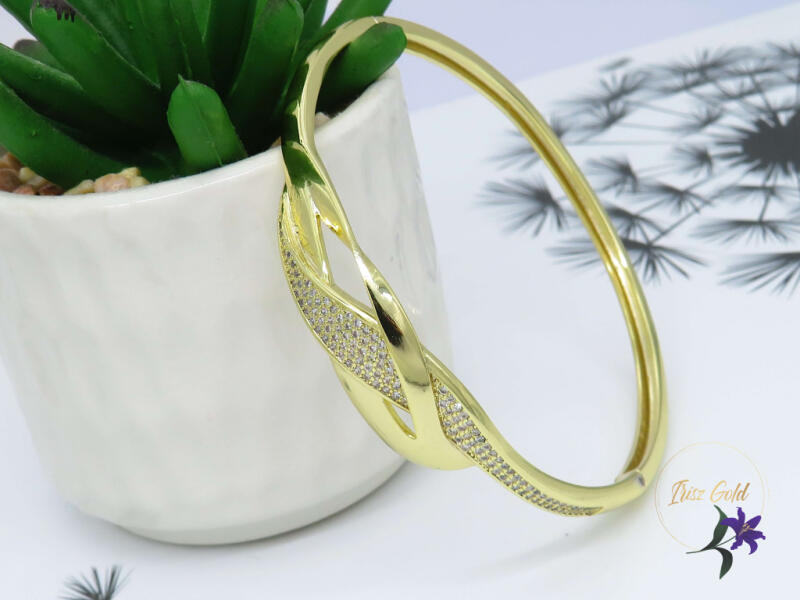 Gold Filled nyitható karperec cirkóna kövekkel díszítve Szin: 14K Méret: 60 as 19 cm -es csuklóra jó Szélesség 10-3mm A forgalmazott divatékszerek alapanyaga nikkel és ólommentes ezért többnyire nem okoznak allergiás tüneteket, nyugodtan hordhatják fémérzékeny emberek is. Általában nem színezik a bőrt és más divatékszerekhez képest nagyságrendekkel jobb kopásállós