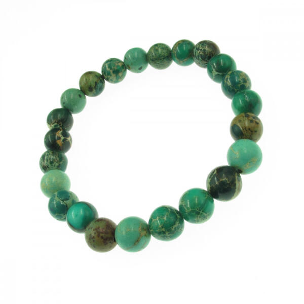 Malachit színű regalit imperiál jáspis gumis karkötő. A gyöngyök mérete 8mm, a karkötő hossza választható A karkötőből több darab elérhető, a fotó a raktáron lévő valamely ékszerről készült, így mintázata némileg eltérő. A jáspis vélt hatása