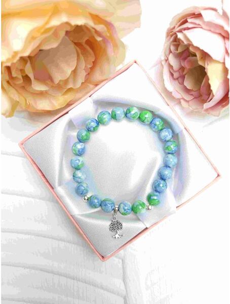 A karkötő egyedi tervezésű, mely színes kalcedon ásványokból készült életfa medállal.