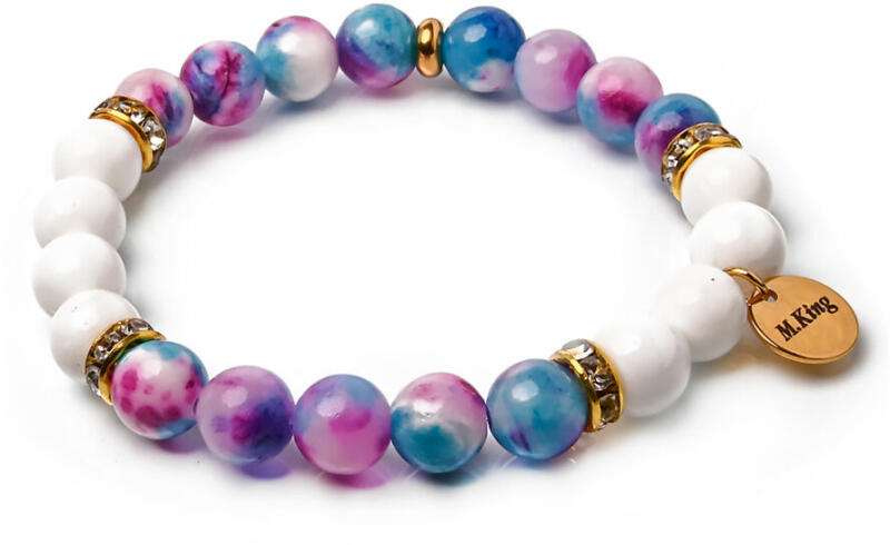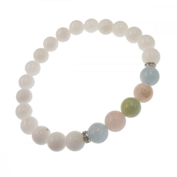 Berill drágakő karkötő. A berill csoport tagja a kék színű akvamarin, a rózsaszín morganit, a sárga, sárgás-zöld heliodor, a zöld smaragd zöldes-sárga krizoberill (macskaszem), a vörös színű bixbit a színtelen goshenit, ... A karkötőben elsősorban a kék színű akvamarin, a rózsaszín morganit, és a sárgászöld heliodor található a tejkvarcok közt. A karkötőt a cs