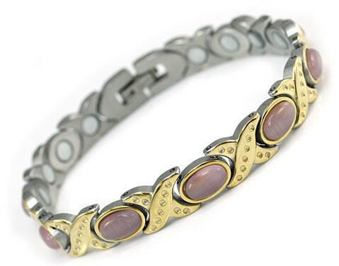 Cikkszám: 0352 Női mágneses karlánc: - rozsdamentes orvosi acélból ( a nemesacél allergiamentes változata ), - külső oldalán arany bevonttal, - 7 db mágneskoronggal, - rózsaszínű, ovális macskaszem opálokkal. Hossza: 18 cm Szélessége: 0,8 cm Súlya: 30 g Különlegesen szép, mágneses női ékszer ! A megadott méreteket kérjük vegyék figyelembe ! A mágneses terápia teljes