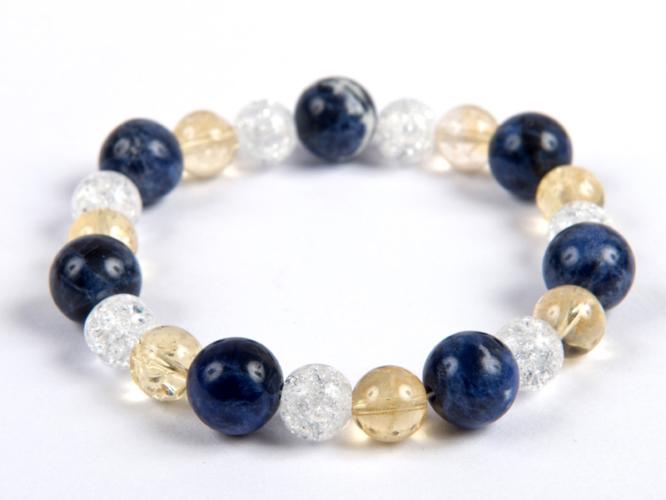 A karkötőben a 10 mm-es szodalit szimbolizálja az éjszakai égboltot, a 8 mm-es sárga citrin a napfényt és a 8 mm-es repesztett hegyikristály, pedig a csillagok tündöklő fehér fényét. Gumis karkötőt készítettünk a felsorolt ásványokból. A citrin a gazdagságot hozó kristályok közzé tartozik. Vonzza a sikert és a gyarapodást. Serkenti a kreativitást, az önkifejezést.
