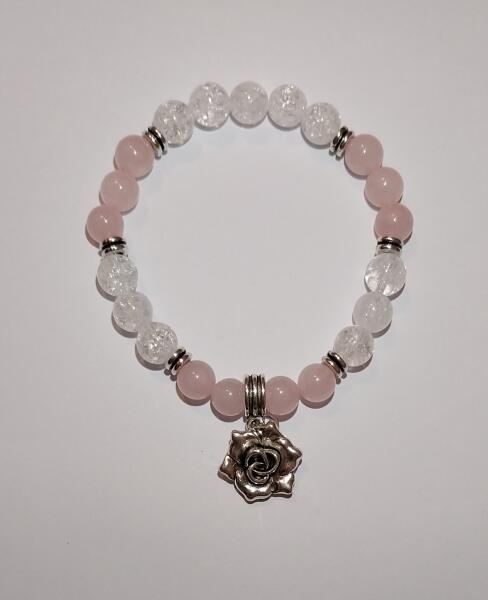 Hegyikristály és Rózsakvarc ásványból készült női karkötő rózsa medállal Gyöngyök mérete: 8 mm-es ásványgyöngyök Rugalmas, gumis ékszerdamil alapra készült A Hegyikristály a 12 mesterkristály egyike. A hegyikristály hatása rendkívül sokoldalú, mestergyógyító. Erősíti más ásványok hatását, ezért bármilyen ásvánnyal együtt használhatjuk, illetve viselhet
