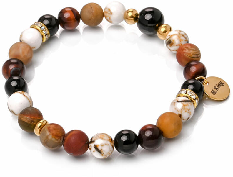 Őrült barnák és aranyak kavalkádja ezen a jáspis, achát és tigrisszem ásvány karkötőn, színek és textúrák vidám és változatos elegye. A Maria King kollekció exkluzív darabja. Figyelem! A képen exkluzív kivitelű, rugalmas karkötő látható kapocs nélkül, de kérheted extra erős acélsodronyra is delfinkapoccsal és 5 cm hosszabbítólánccal. Ha a kapcsos verziót kére