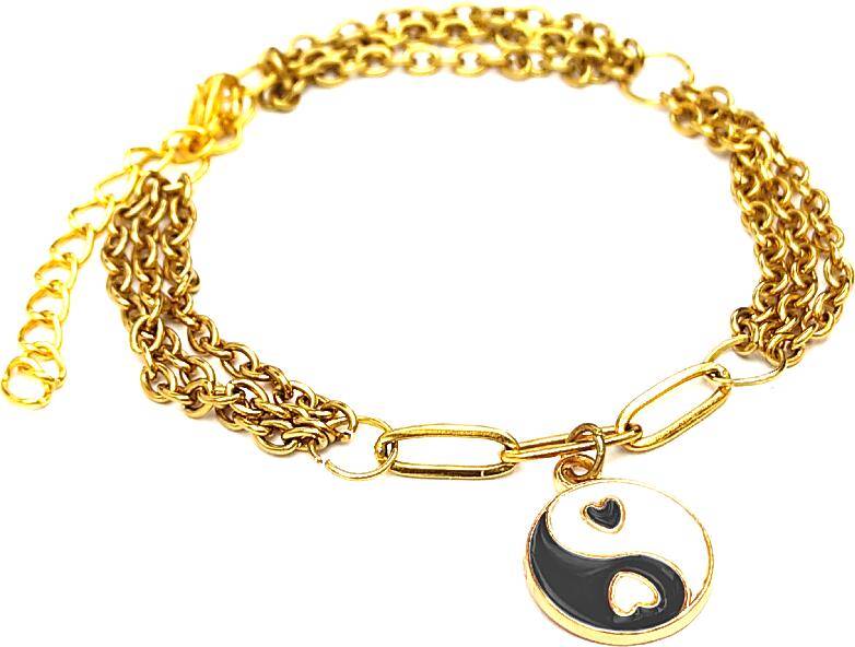 Három soros divat karkötő fekete-fehér szív motívumos jin-jang charmmal, arany színű. Paraméterek: Charm mérete kb. 1,5 cm. Anyaga fémötvözet, karkötő anyaga rozsdamentes acél. Karkötő mérete 17+5 cm. (Ha ettől eltérő méretet szeretnél, rendeléskor a MEGJEGYZÉSBE írd be. )