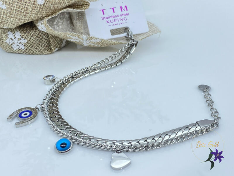 Gyönyörű dupla láncos szerencsehozó karkötő Szin: rodium nemesacél Méret: 18+3cm Szélesség: 10 mm -2mm A forgalmazott divatékszerek alapanyaga nikkel és ólommentes ezért többnyire nem okoznak allergiás tüneteket, nyugodtan hordhatják fémérzékeny emberek is. Általában nem színezik a bőrt és más divatékszerekhez képest nagyságrendekkel jobb kopásállósággal rendelke