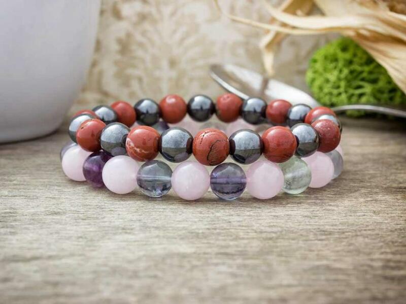 Várandós kismamákat segítő ásványokból két külön karkötőt készítettünk, amit párban ajánlunk hordásra, úgy ahogy azt a fotón is láthatod. Az egyik gumis karkötőt 8 mm-es rózsakvarc és fluorit valódi ásvány gyöngyök alkotják, a másikat jáspis és hematit ásványok. Várandós kismamákat segítő ásványok , melyek támogatják az örömteli kilenc hónapot, majd