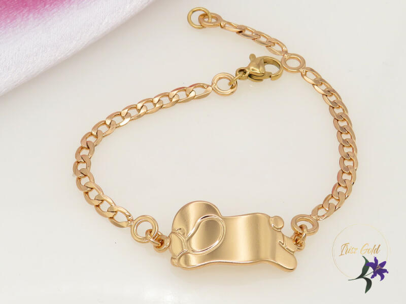 Gold Filled gyermek karkötő középen kutyus köztessel kerekszemes lánccal Szin: 18K Méret: 15-17 cm lánc 2mm Köztes: 25x13mm Gravírozást mindenki csak sajátfelelősségére tegyen bele! A forgalmazott divatékszerek alapanyaga nikkel és ólommentes ezért többnyire nem okoznak allergiás tüneteket, nyugodtan hordhatják fémérzékeny emberek is. Általában nem színezik a bőrt és