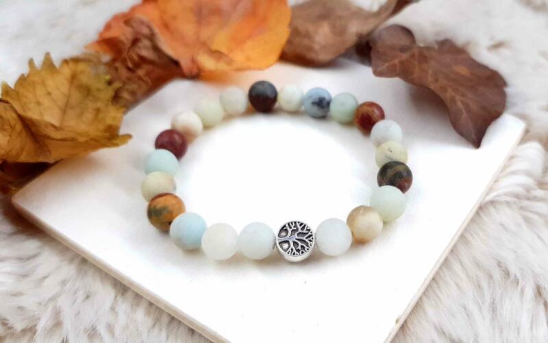 Egyedi tervezésű matt amazonit ásványokból készült őszi hangulatú ásványkarkötő életfa medállal.
