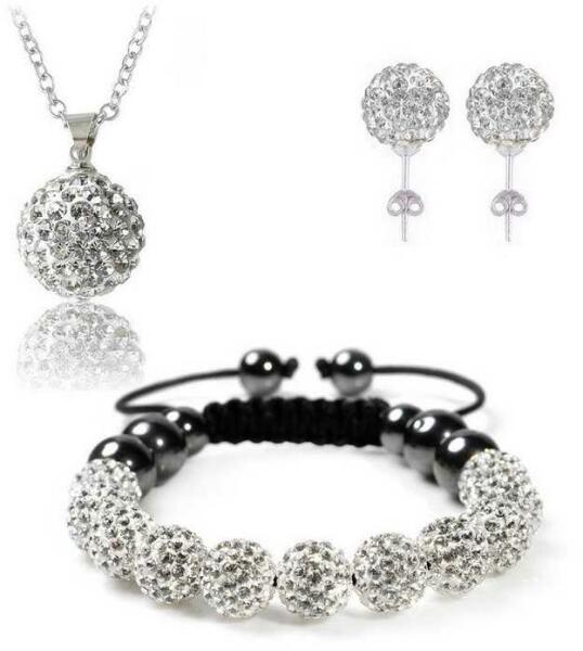 Swarovski kristályos szett. Nyaklánc, medál, karkötő, fülbevaló. Fehér. Swarovski kristályokkal díszített, szett. Nyaklánc medállal, állítható méretű karkötő és fülbevaló. Alkalmi és mindennapi öltözethez. TULAJDONSÁGOKFehér szín Swarovski kristály állítható méret nyaklánc, medál, fülbevaló, karkötőMÉRETEKgömbök átmérője: 1 cm nyaklánc hossz: állíth