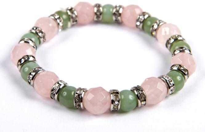 Ez a különleges ásvány karkötő 10 mm-es fazettált rózsakvarc és 8 mm-es jáde felhasználásával készült duplasoros gumira fűzve. Díszítőelem : 8 mm-es strasszgyűrű. A karkötő méretének meghatározása : a csuklód méretéhez adj hozzá 1,5 cm-t. Az ásványok nem helyettesítik az orvosi diagnózist és kezelést. A jáde hatása : a jáde bevonzza életedbe a szerencsét.
