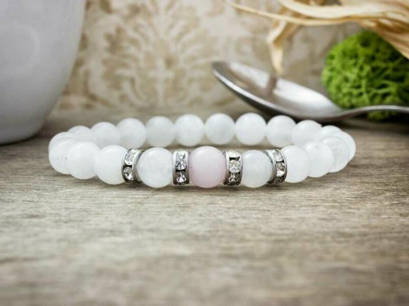 A gumis karkötőt 8 mm-es rózsakvarc és holdkő ásvány gyöngyök alkotják. A valódi ásvány karkötőt díszítő kristályokkal kirakott 4 db fém köztes elem acélból / orvosi fémből készült, így tökéletesen antiallergén . A rozsdamentes acél dísztő elem nem kopik, napi használat mellett is sokáig megőrzi szépségét . A nők állítólag mindent megtesznek azért , hog