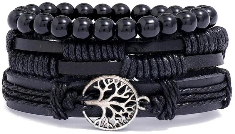 Silver Tree of Life Férfi karkötők Ez a fekete színű karkötőszett az elegancia és a szimbolika ideális kapcsolatát jeleníti meg. Az egyik karkötő mutatós ezüst színű Életfa medállal díszített, ami a természettel való összeköttetést és a végtelen növekedést jelképezi. A szett három darab karkötőt tartalmaz, amelyek viselhetők együtt, de külön-külön is, aminek