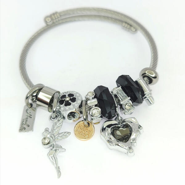 Ezüstszínű nemesacél ( 316L ) pandora jellegű karperec, melyet tündér, szív charmok, fekete és fehér kristályok díszítenek. A kristályok ragasztott, peremezett foglalatban helyezkednek el. A charmok antiallergén ötvözetből készültek, ródium bevonattal. Mutatós, különleges darab. Tartó, időtálló ékszer, nem feketedik, nem színezi a bőrt. Folyamatos használatra is alk