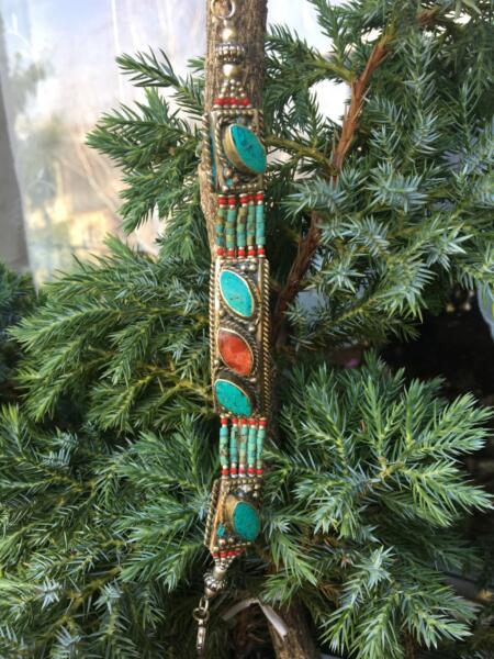 Tibeti ezüst kézzel készített karkötő, türkiz, korall és lapis lazuli kövekkel.