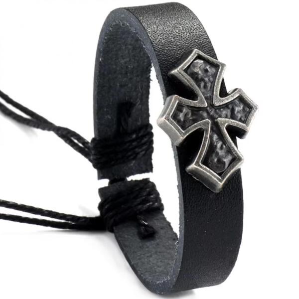 Strong Karkötő-Sapid Cross Ez a karkötő robusztus fém kereszttel a fekete bőr szíjon tökéletes kiegészítő azok számára, akik értékelik az erős szimbólumokat és a kifejező stílust. A fém kereszt részletes domborműve a bátorságot és eltökéltséget szimbolizálja, miközben a fekete bőrrel kombinálva modern, de egyben időtlen megjelenést teremt. Az állítható zár b