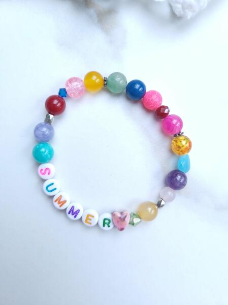 Álomszép ásványkarkötő SUMMER felirattal, mely gyönyörű csiszolt, és törmelék ásványokból készült. Minden egyes darabot egyedileg készítünk el, véletlenszerűen színes ásványokból és kristályokból, ezért a képen láthatótól eltérő lehet.