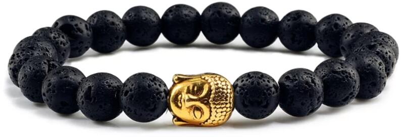 A karkötő lávakő ásványból és arany buddha fejes medál díszítéssel készült.