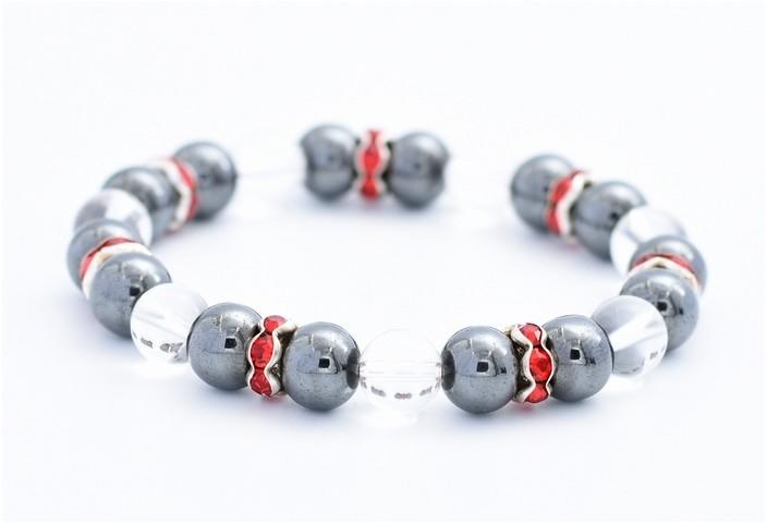 Kézi készítésű, rugalmas karkötő, hegyikristály és hematit kristályokkal. hegyikristály hematitÁllítható, rugalmas méretmérete: 8 mmMéret: 17-24 cm-es csuklóra Súly: 27 gramm
