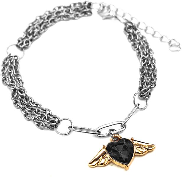 Három soros divat karkötő fekete kristály angyalszárnyas charmmal, ezüst színű. Paraméterek: Charm mérete 2,5 cm. Anyaga fémötvözet és kristály, karkötő anyaga rozsdamentes acél. Karkötő mérete 17+5 cm. (Ha ettől eltérő méretet szeretnél, rendeléskor a MEGJEGYZÉSBE írd be. )