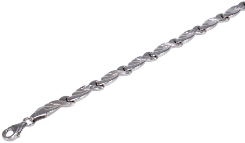 Modern stílusú, kedvelt fazonú, ródiummal bevont, üreges kialakítású, stiftes, mattítással és véséssel díszített fehérarany karkötő.