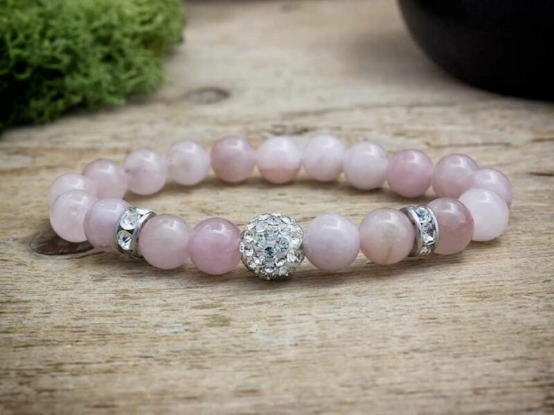 8 mm-es rózsakvarc ásvány golyókból fűzött gumis karkötő. Az ékszer dísze két kristályokkal kirakott gyűrű és egy kristálygömb, melytől ünnepies külsőt kap a karkötő. Hordható elegáns eseményeken és akár hétköznapokon is. Amit a rózsakvarcról érdemes tudnod: A festetlen rózsakvarc az egész világos, szinte áttetszőtől, a ködös középrózsaszínig terjed. A